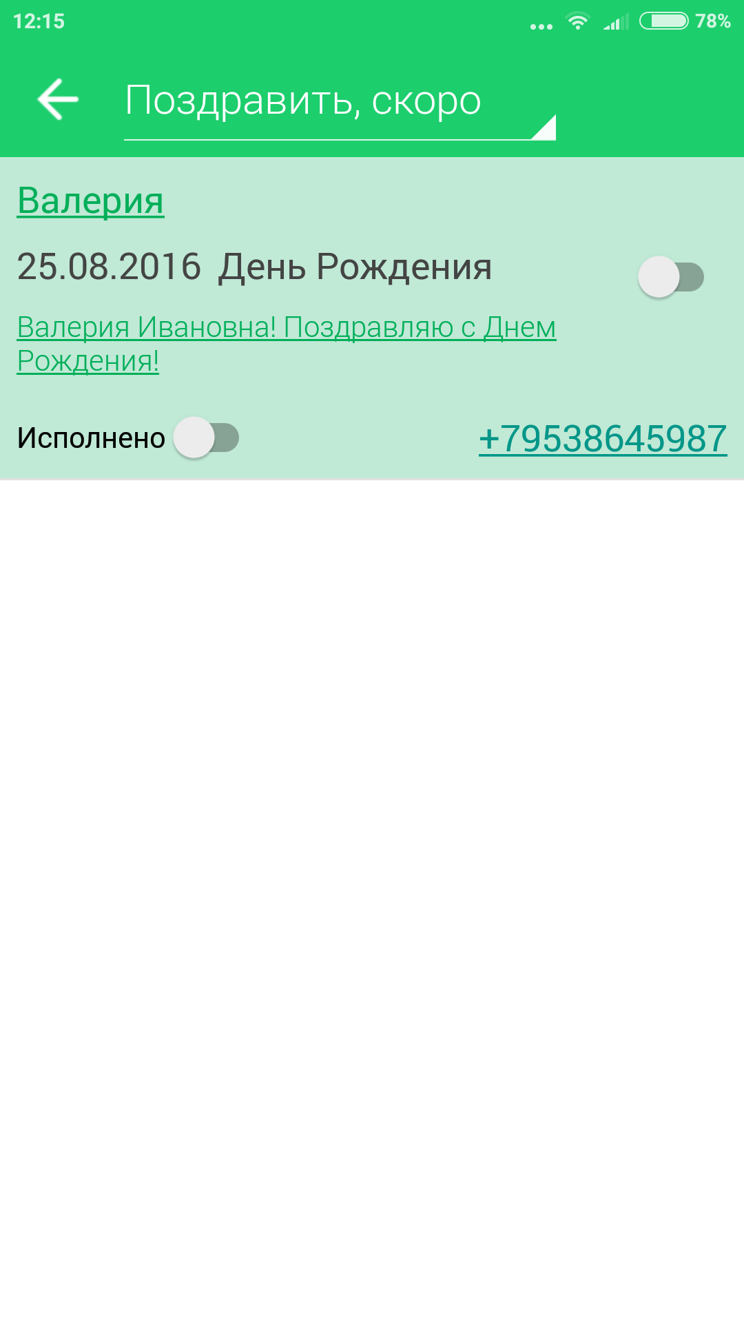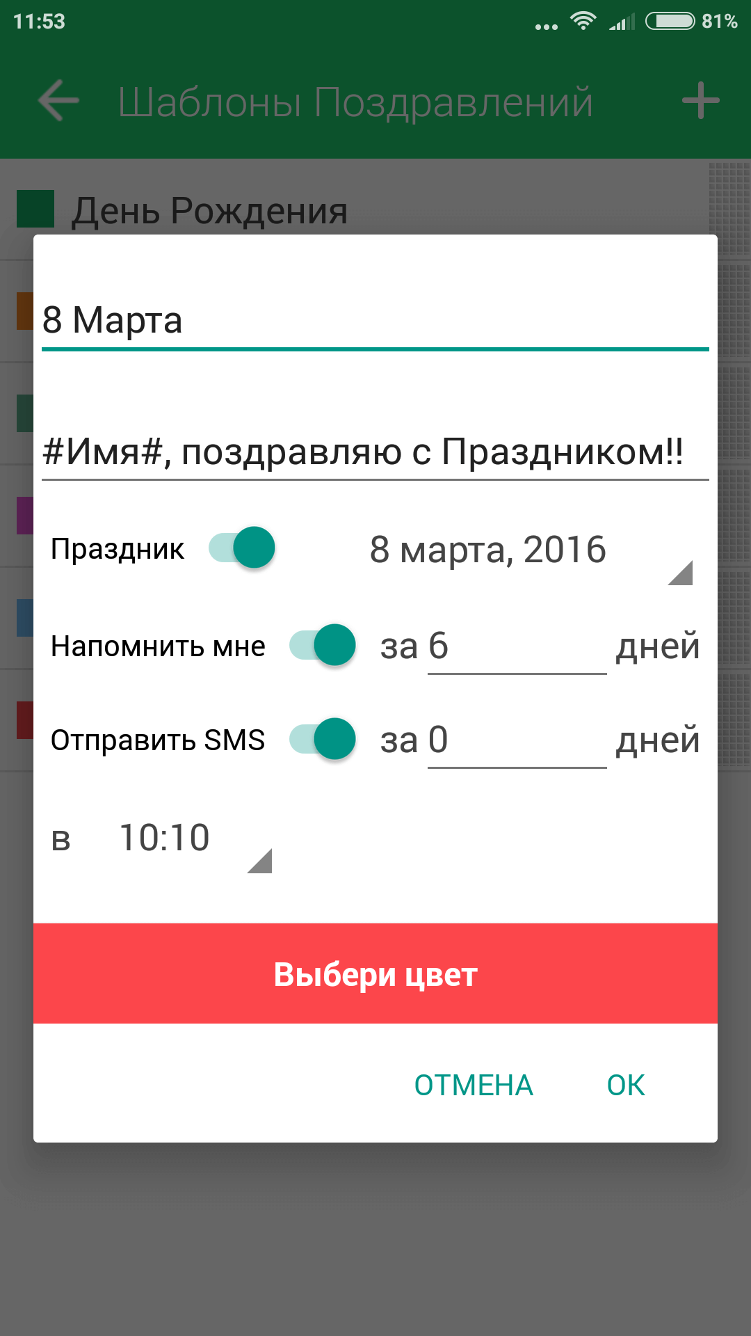 В Шаблоне (и в поздравлении) определите, нужно ли уведомлять вас о событии, нужна ли автоматическая рассылка. Не «округляйте» время для Поздравления. SMS, пришедшая ровно в 12-00 выглядит автоматической.